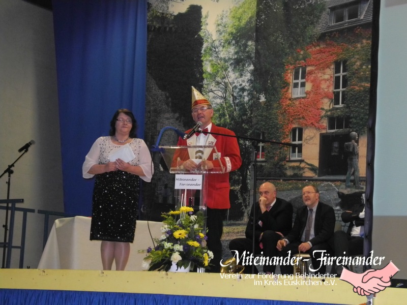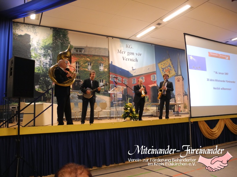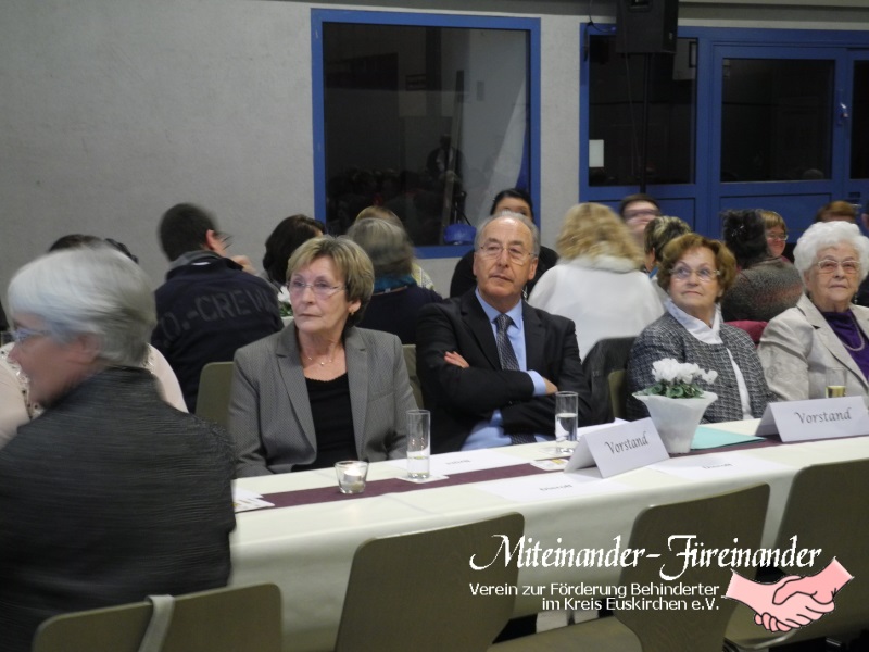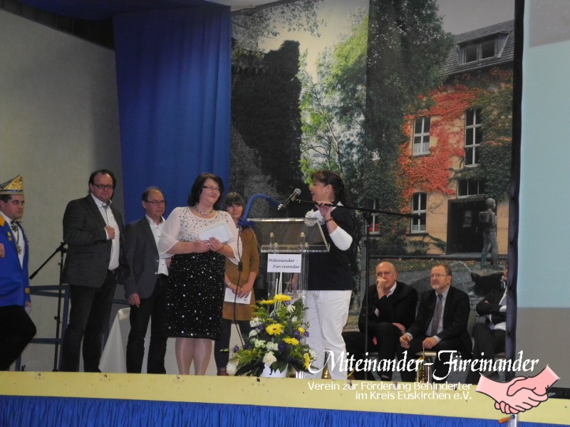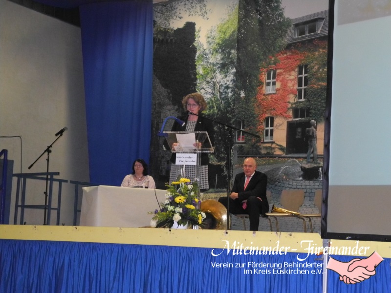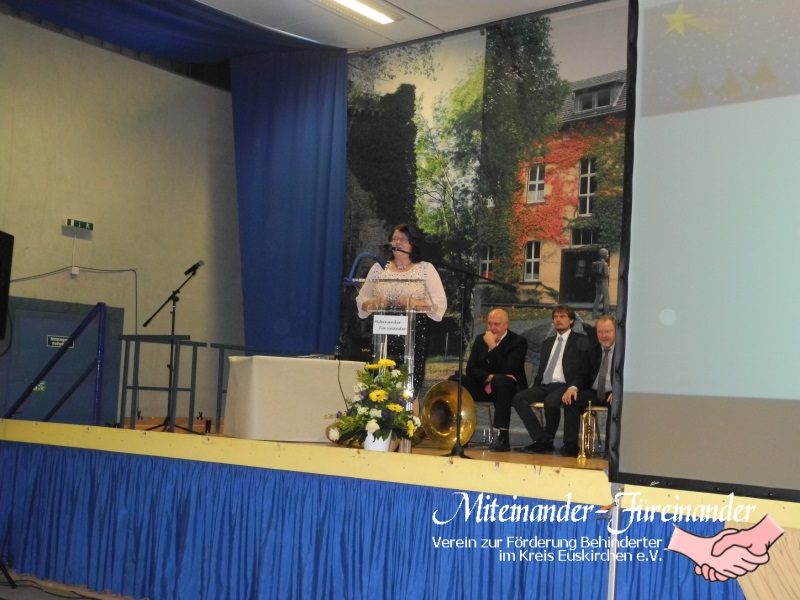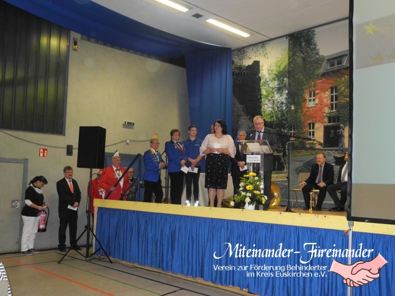 Insgesamt konnte der Verein in den 20 Jahren seines Bestehens über 350.000 Euro für die Unterstützung der Behindertenarbeit im Kreis Euskirchen zusammen tragen. Wichtig ist dem Verein allerdings auch die persönliche Betreuung von behinderten Menschen. So sind Karnevalssitzung, Weihnachtsbasar, Sommerfest oder Ferienmaßnahmen immer wieder Gelegenheiten, gemeinsam mit den Bewohnern der Wohnstätten zu feiern. Bürgermeisterin Anne Horst, hob in Ihrer Rede die Arbeit von Miteinander-Füreinander besonders hervor. „Ich sage dem Verein Miteinander-Füreinander meine Unterstützung auch für seine zukünftige Arbeit zu.“