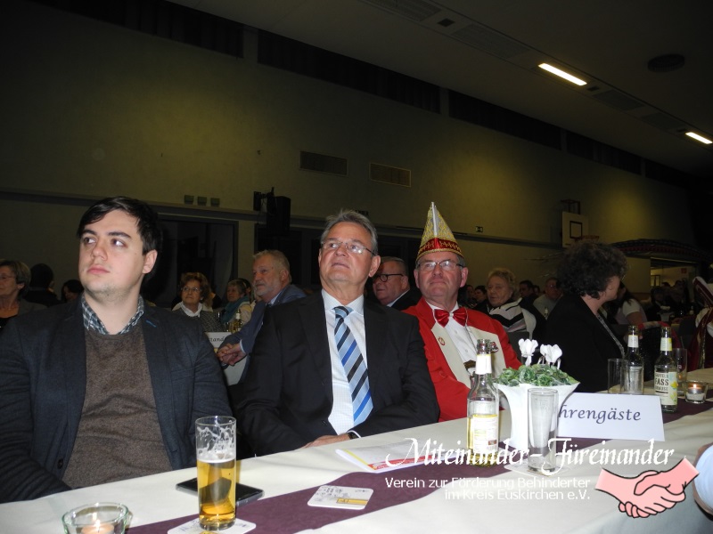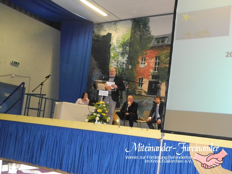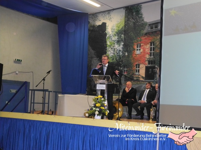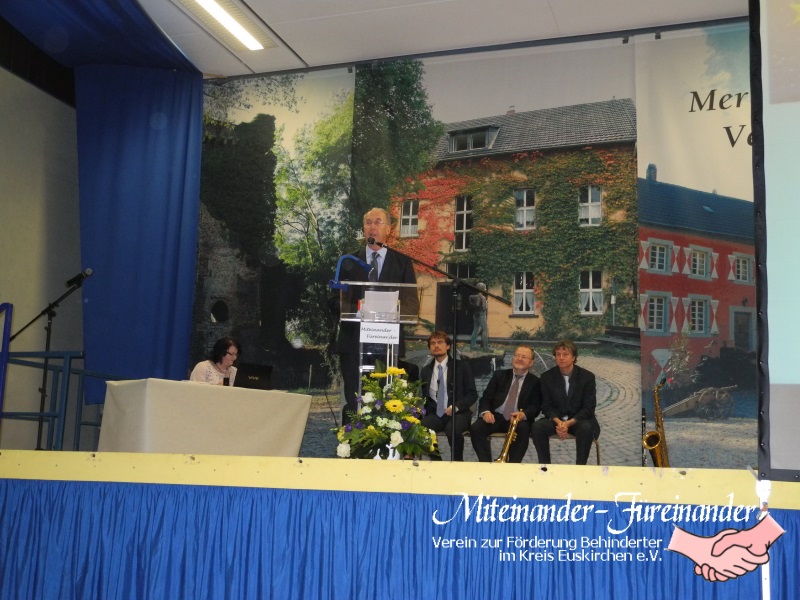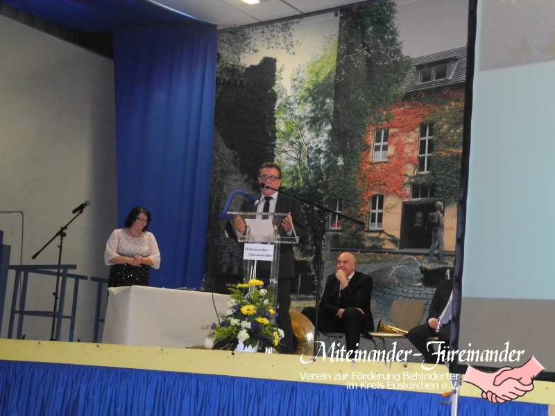 Gründungsmitglied Gerd Brühl zog in seiner Ansprache Bilanz über die bisherige Arbeit des Vereins, und die kann sich wahrlich sehen lassen. Am 06.01.1997 hatten 9 Frauen und Männer den Verein zur Förderung behinderter Menschen im Kreis Euskirchen gegründet. Heute hat Miteinander-Füreinander über 250 Mitglieder. Übrigens: Erstes Mitglied wurde seinerzeit Landrat Günter Rosenke. Er dankte in seiner Ansprache allen, die sich über den langen Zeitraum hinweg für behinderte Menschen engagierten. „Lange bevor Inklusion und Integration bei Politikern ein Thema war, hat Miteinander-Füreinander dies in Weilerswist bereits gelebt“, so Landrat Rosenke.