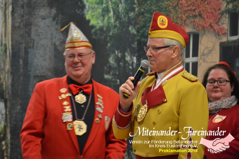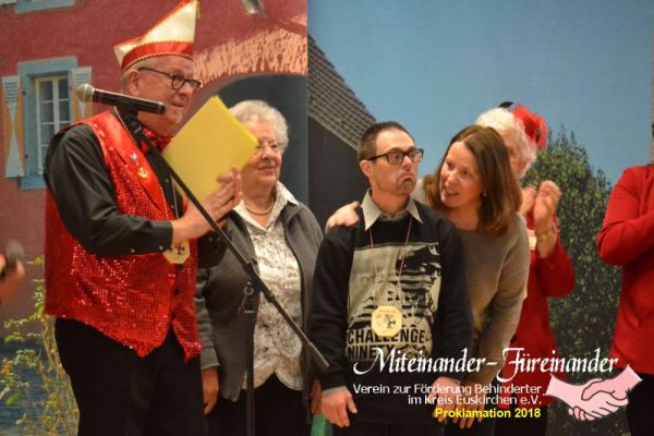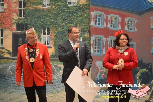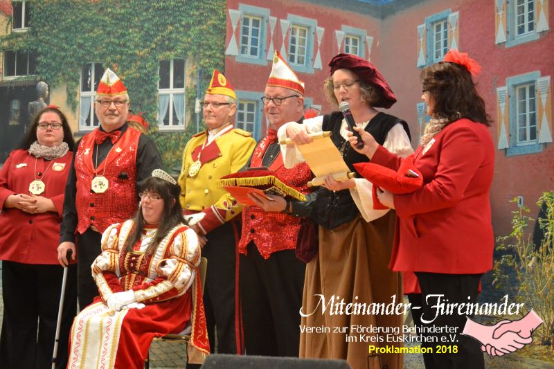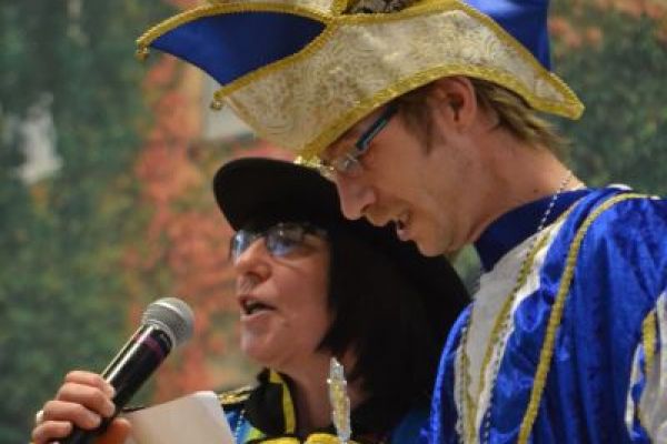 Dann der Höhepunkt, die Proklamation der Neuen Prinzessin , Cornelia II. (Gerhards) durch die Bürgermeisterin Anne Horst. Als Herold kostümiert, nahm sie die Proklamation vor und übergab der Prinzessin die Insignien, das Narrenzepter und den Schlüssel des Rathauses. Cornelia bedankte sich mit dem ersten Sessionsorden und nahm der Bürgermeisterin die Verpflichtung ab, am 08.02.2018 im Rathaus eine Karnevalistische Feier ( keine Rathsitzung) zu veranstalten, zu der sie mit dem ganzen Gefolge kommen werde.